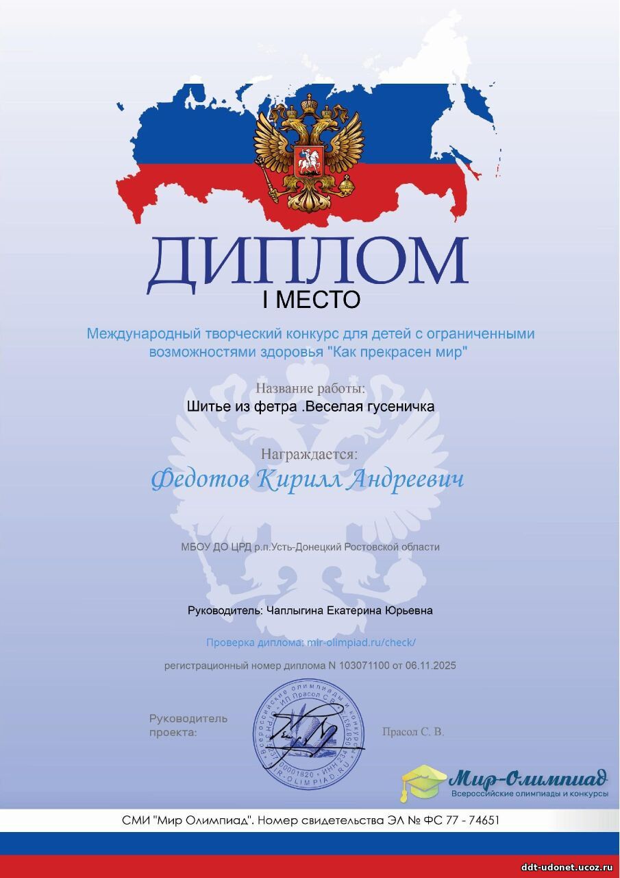 Федотов Кирилл, Гуценко Виктория, Вербин Дмитрий приняли участие в Международном творческом конкурсе для детей с ОВЗ "Как прекрасен мир" и заработали почетные грамоты.
